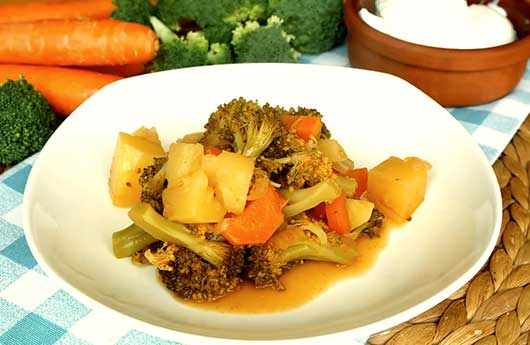 Doğranmış havuç ve patatesi tencereye ekleyerek 5 dakika kadar kavurun. Çiçeklerine ayrılıp yıkanmış brokoliyi ilave edip 4-5 dakika daha kavurmaya devam edin. Yemeğe, tuz, şeker ve kırmızı toz biberi ilave edin.